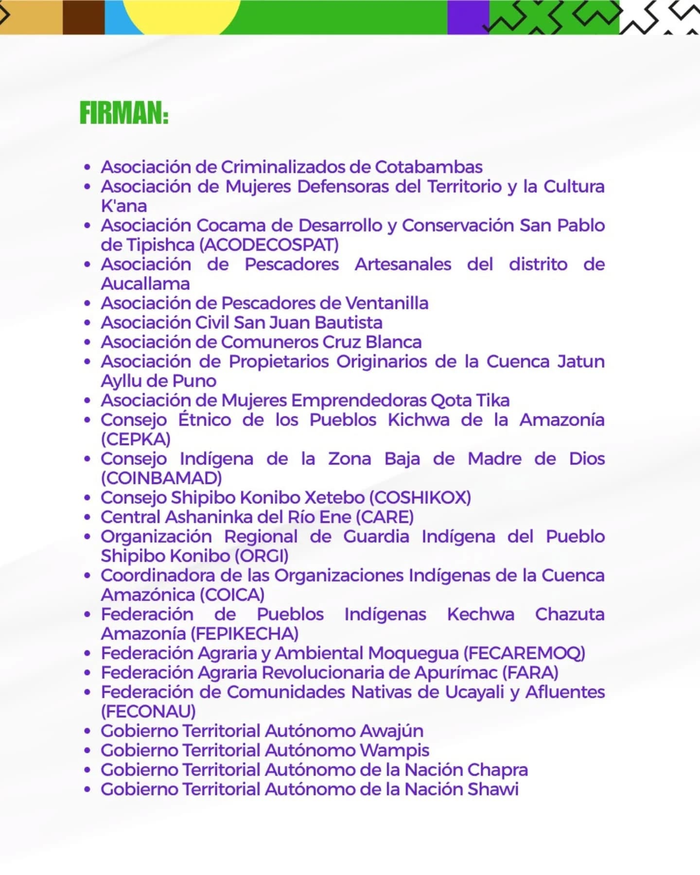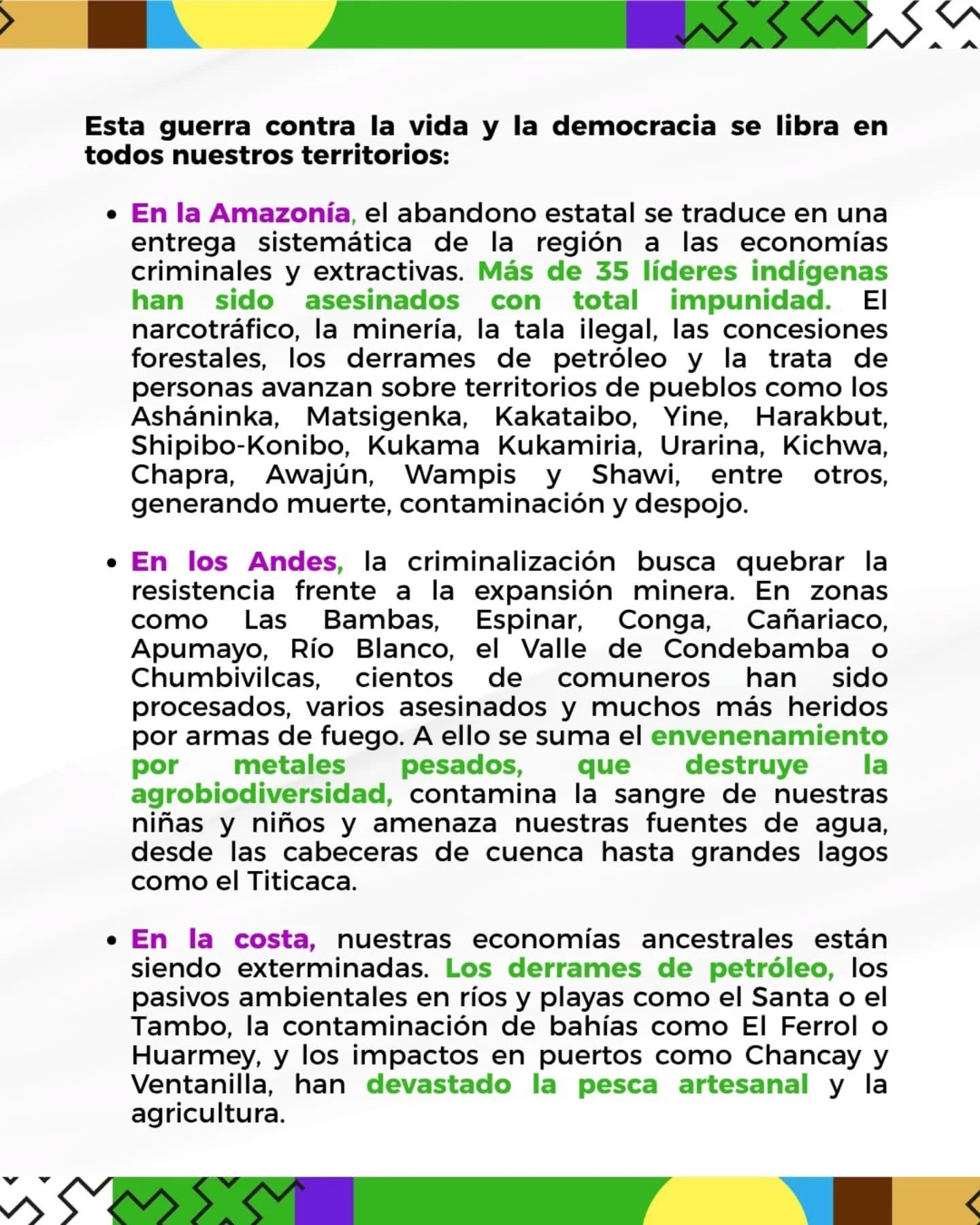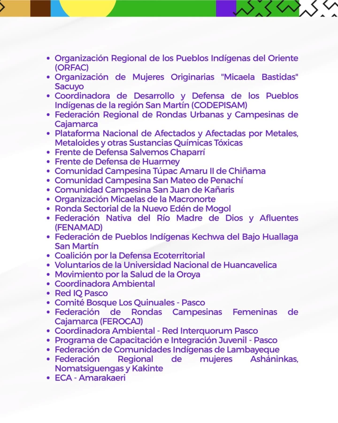 Desde hace cinco años venimos defendiendo la vida, articulando a más de 90 defensoras y defensores de 20 regiones del Perú. Desde los Andes, la AmazonÃa y la costa, autoridades indÃgenas, dirigentes campesinos, ronderos y activistas ambientales caminando juntxs por la defensa del territorio, la organización comunitaria y el cuidado colectivo para sostener el buen vivir.